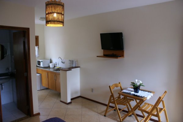 Varanda, área de serviço, ar condicionado, frigobar, TV LCD 26 Pol, coz.americana e forno micro ondas.